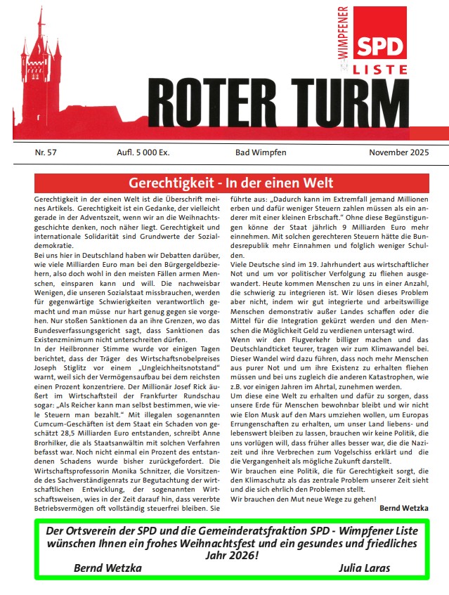 Im Anschluss gab Bernd Wetzka einen Ausblick über die weitere Planung des Ortsvereins: eine weitere Ausgabe des Roten Turms in Kürze, Vorbereitungen auf die Landtagswahl am 8. März und eine Veranstaltung mit Vertretern der Wimpfener Bürgerenergiegenossenschaft.